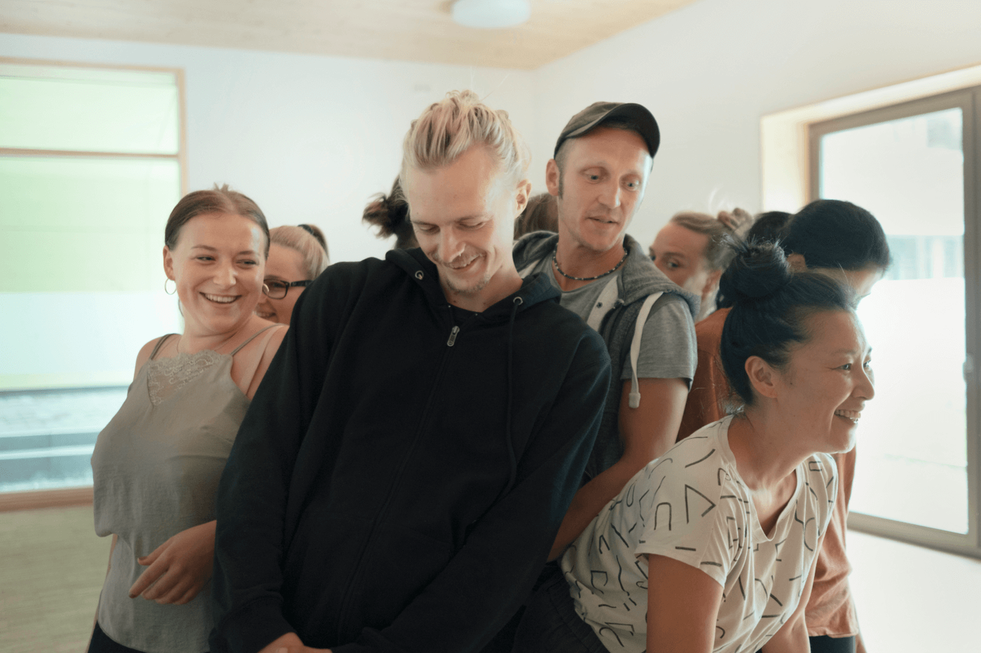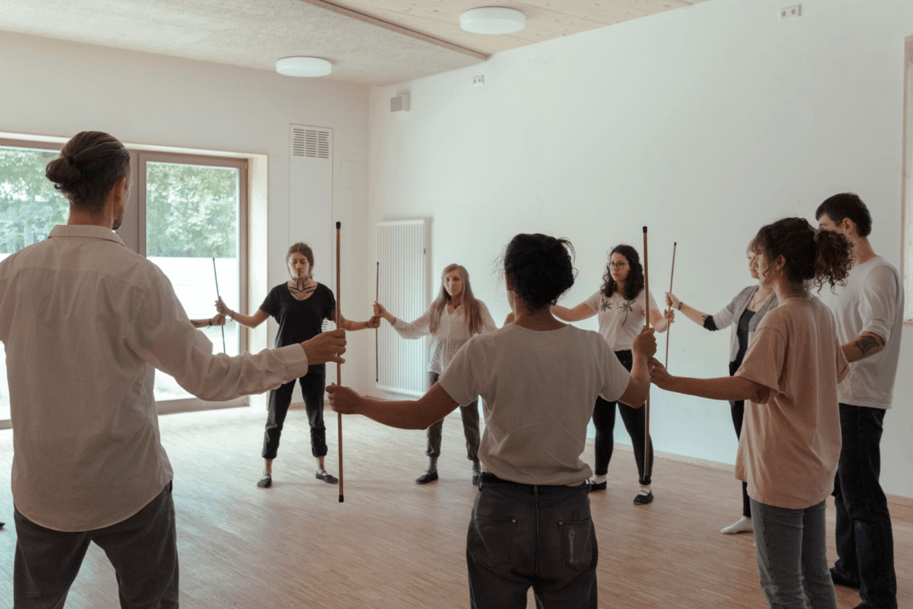 Wir gestalten zudem Raumformen, die sowohl festen als auch freien Gesetzmäßigkeiten folgen. Es gibt geometrische Bewegungen, aber auch selbst improvisierte Abläufe.